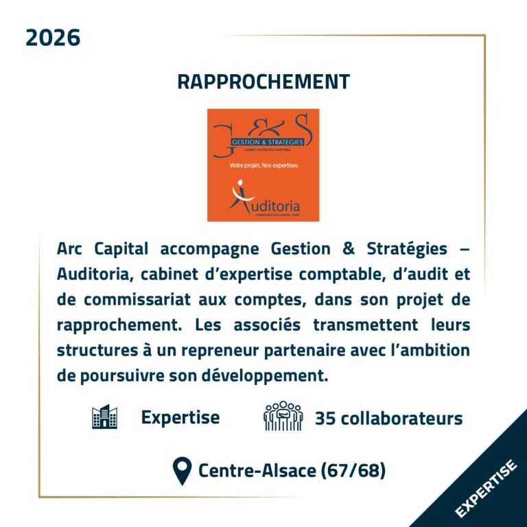 Présent à Paris et à Lyon, Arc Capital est un cabinet de conseil en fusion-acquisition dédié aux entrepreneurs. Intervenant sur trois verticales métiers (Expertise comptable, assurance & immobilier), son équipe vous accompagne et vous conseille sur toutes les étapes clefs d’une transmission ou d’une acquisition en respectant un processus méthodique tout en assurant une parfaite confidentialité de votre projet.